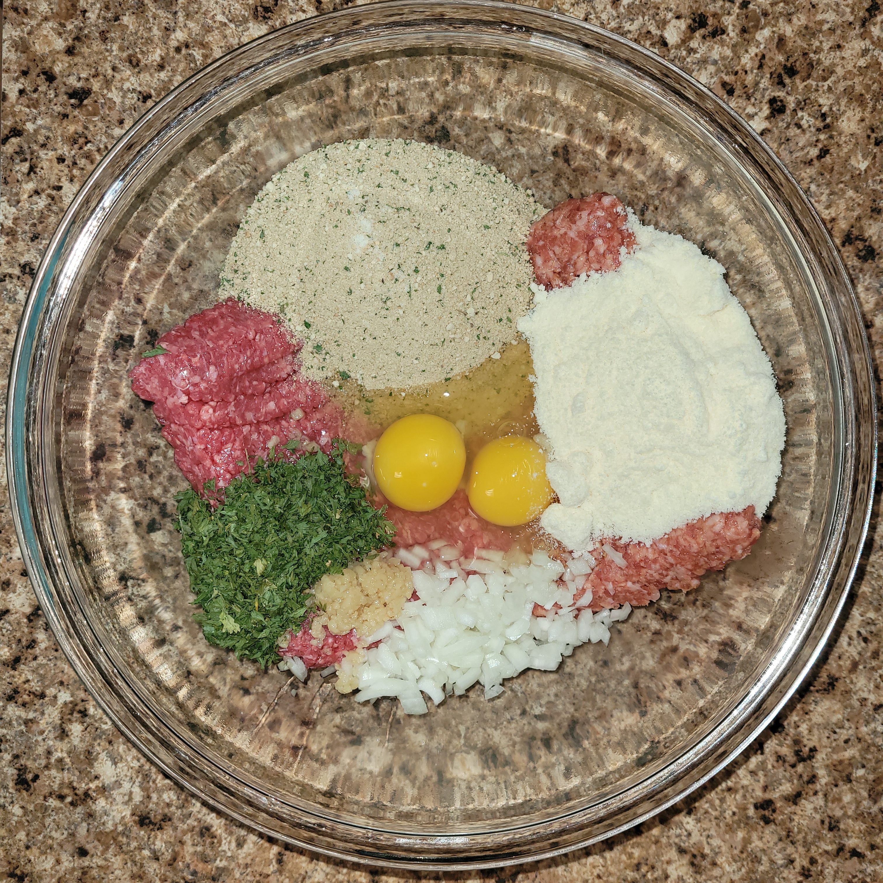 - Add beef, pork, onion, garlic, parsley, breadcrumbs, eggs, parmesan cheese, salt and pepper to a large bowl. Mix together with large spoon or hands