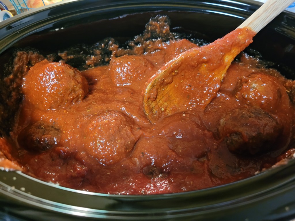 - While Meatballs are getting browned; mix in Crockpot: crushed tomatoes, tomato paste, Italian seasoning, garlic powder, and oregano. Stir well!